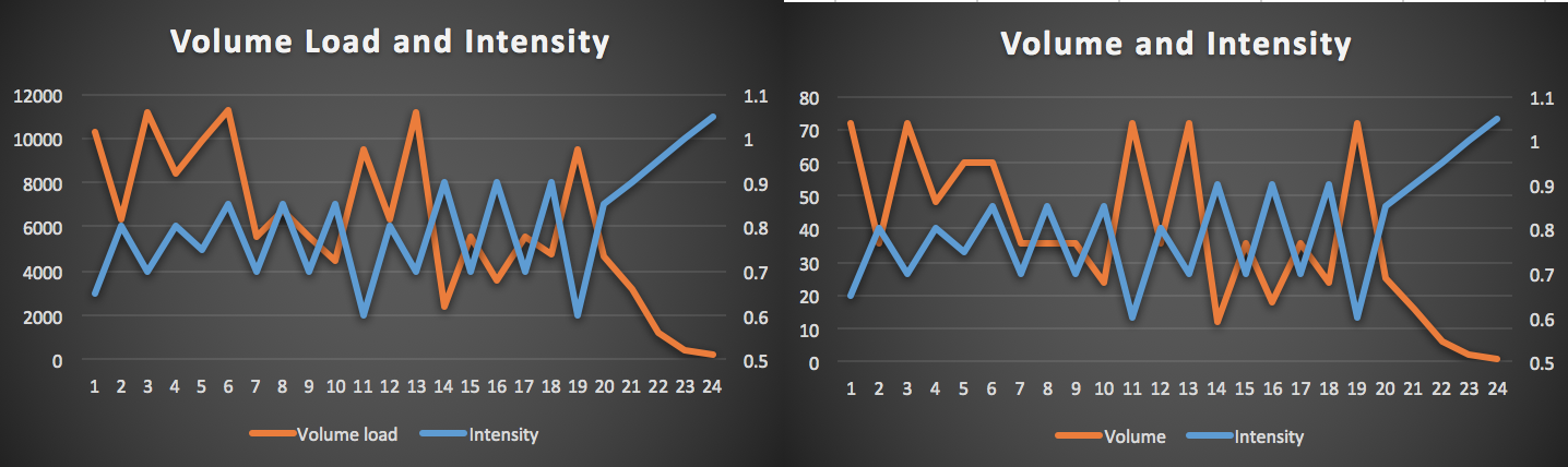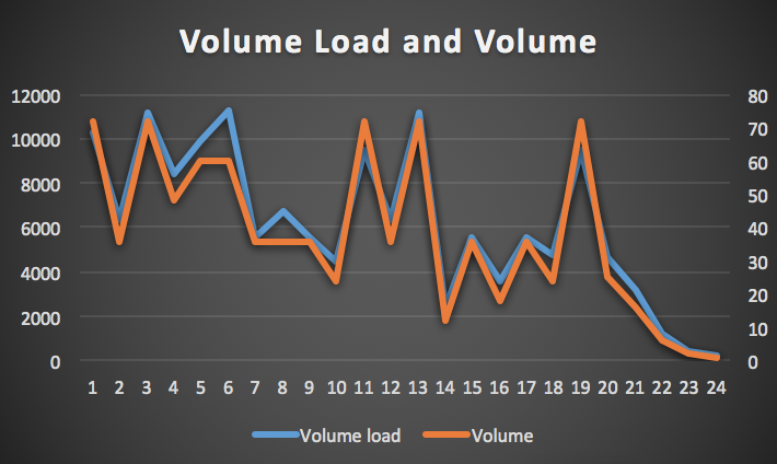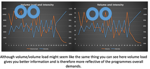 The start of the training cycle in gross terms is much higher in volume load and lower in intensity and at the peak of the block intensity peaks and volume drops away. What we will go through now is why tracking the volume load or “meaningful volume” is more representative of what is actually going on than tracking the volume alone.