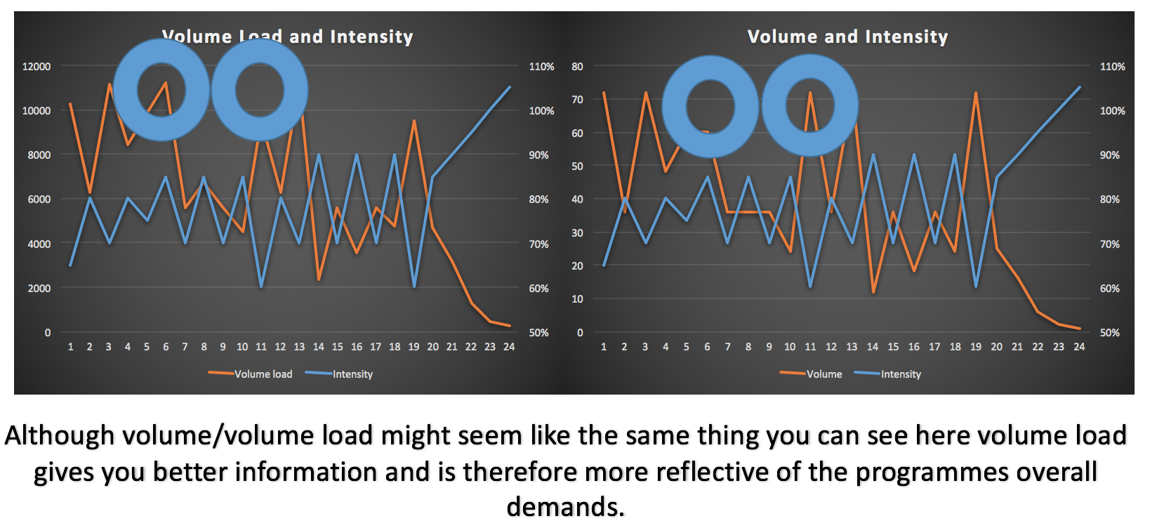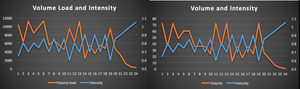 If we put the two together on the same graph and different axis you can see they match up pretty evenly what if we take volume and volume load and plot them both against intensity?