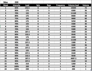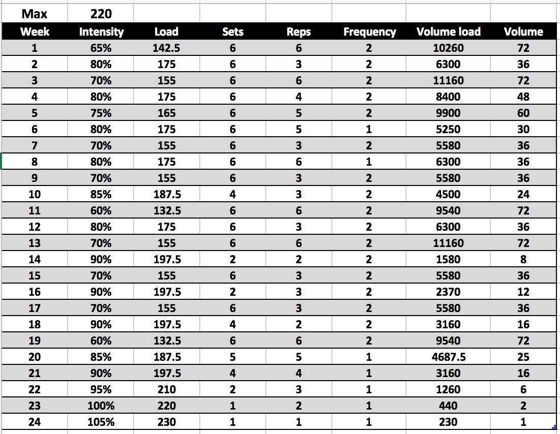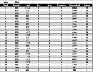 We will now go through an example of a 24 weeks training block for someone with a maximum of 220kg, we would expect a better outcome than 105% but the peak at the end is more for demonstration purposes.