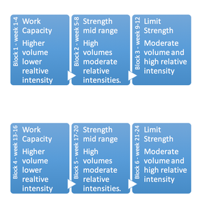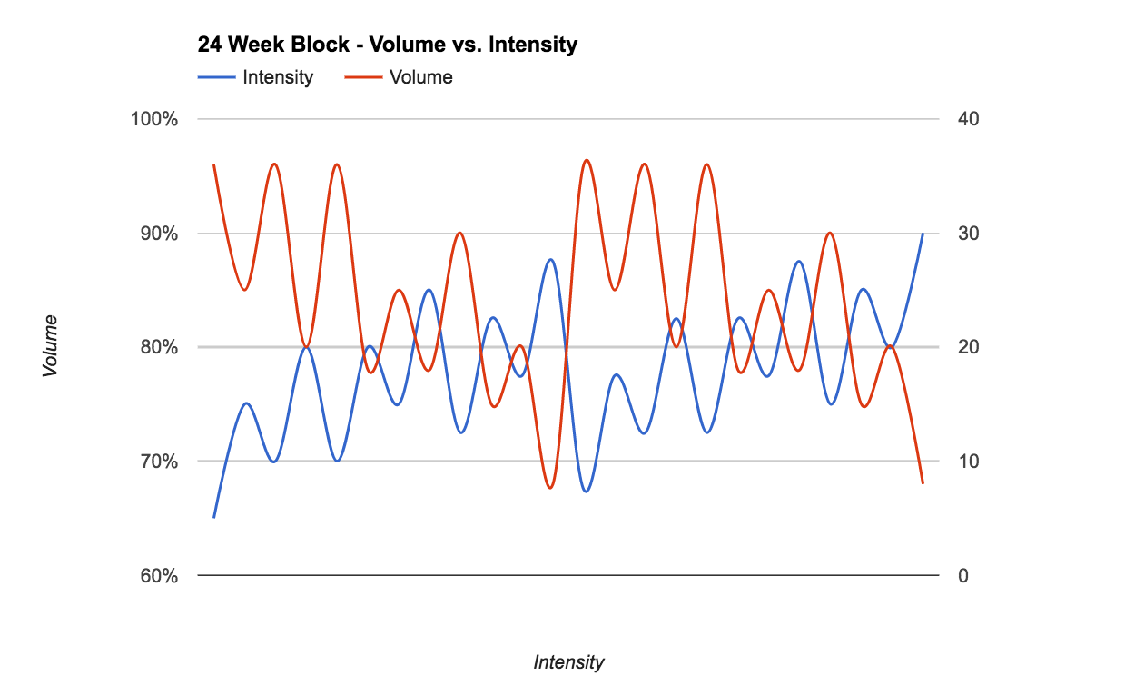 You see here we have a top-down look at the 24 weeks of training you can see we have the goals and generalities outlined in the flow chart above and you can see in more detail how that looks from a week to week view using intensity and volume as our measures.