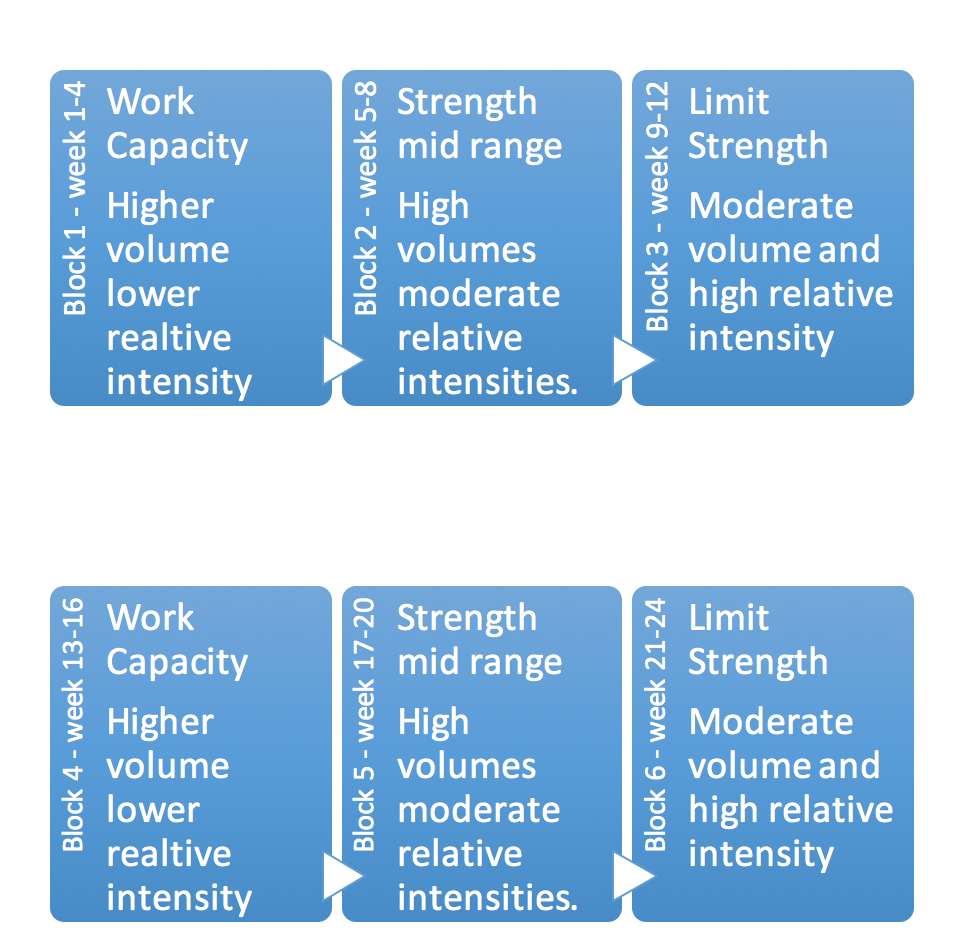You see what we are presented with as lifters or people online is usually a stand-alone macrocycle or mesocycle which on it’s own isn’t really much of anything. If we were to put it into another context where we have a year of training (macro-cycle) and the first 6 months of that are 2×12 week training cycles which follow a similar thread of thought. This might look something like this.