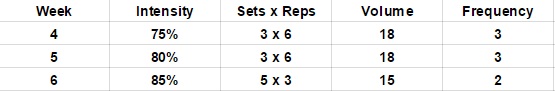 Goal – to allow the lifter to freshen up and get in 3 weeks of good work.  This phase of the programme can be used to focus on thecnique and to begin to develop as much bar speed as possible.  The focus for this part of the programme should be taking the bar down with immaculate technique and returning it back to lock out with maximal acceleration.  The workouts should be very easy but that is the entire point of the block.  The lower workloads should also allow the lifter a chance to acclimatise to a 3x a week frequency.